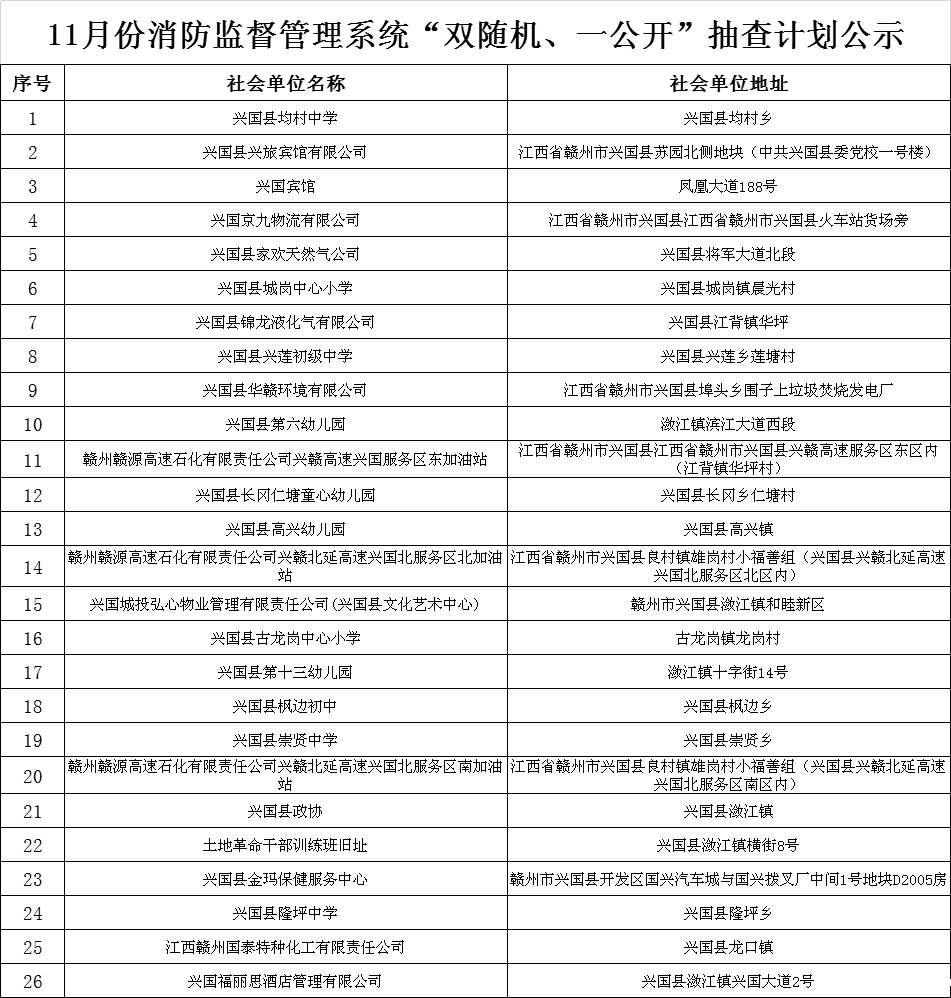 为深入推进全市火灾防控工作,进一步预防和减少火灾危害,保障公共安全,督促各单位、各场所尽职尽责,根据《中华人民共和国消防法》、《消防监督检查规定》等有关法律法规要求,兴国县消防救援大队将依法开展“双随机、一公开”消防监督抽查,特制定抽查计划并公告如下: