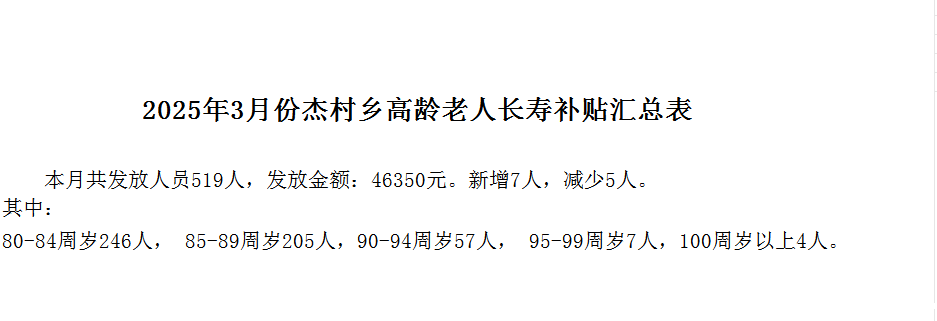 2025年3月份高龄老人长寿补贴汇总表