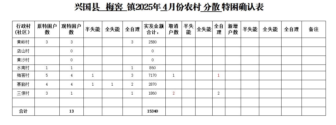 【特困供养】梅窖镇2025年4月份农村分散特困发放汇总表