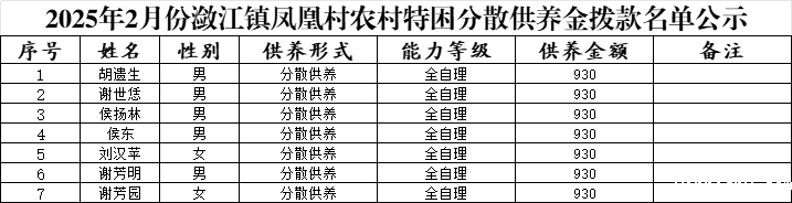 【养老服务】2025年2月份潋江镇凤凰村农村特困分散供养金拨款名单公示