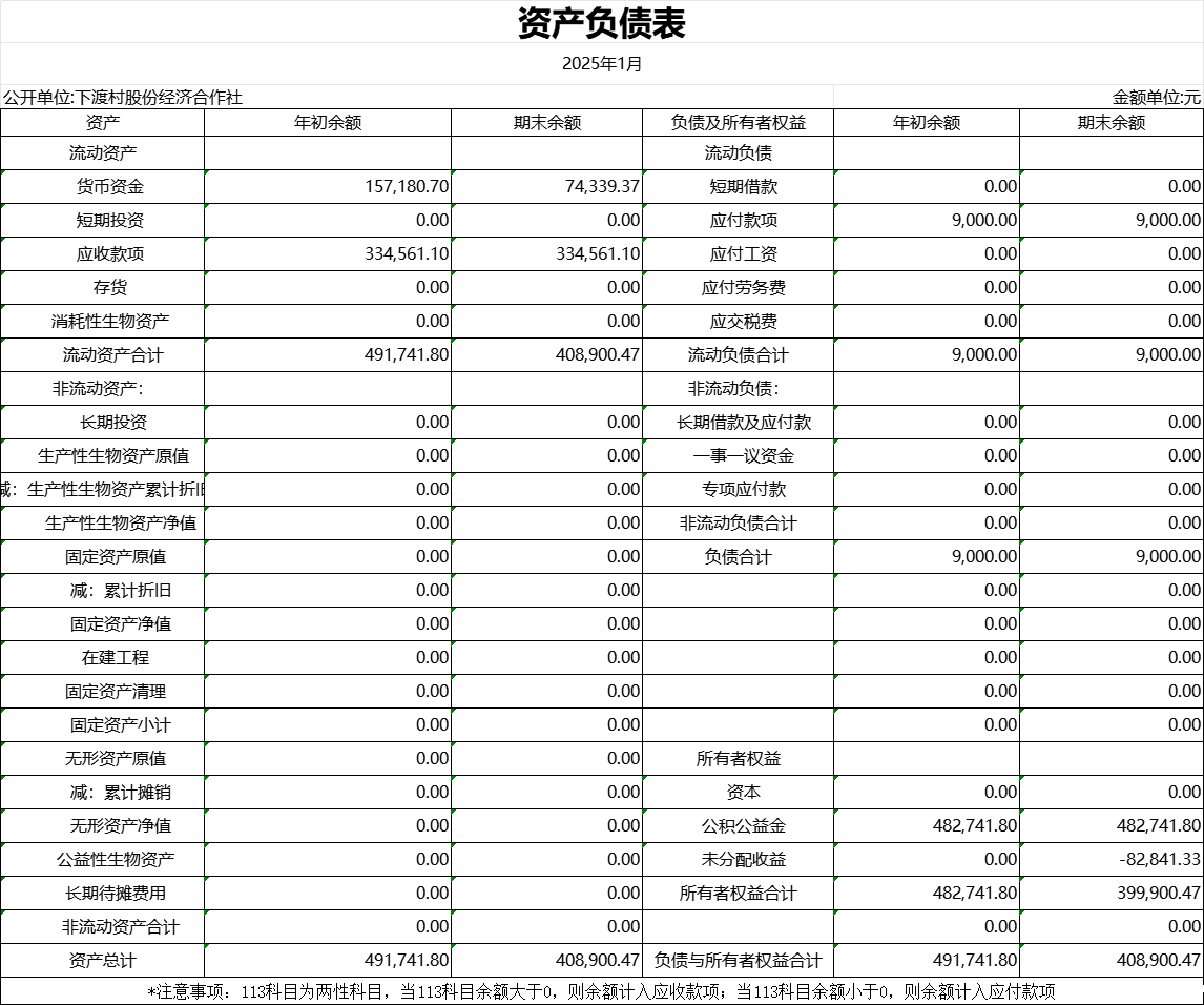 下渡村股份经济合作社2025年1月份资产负债表公示