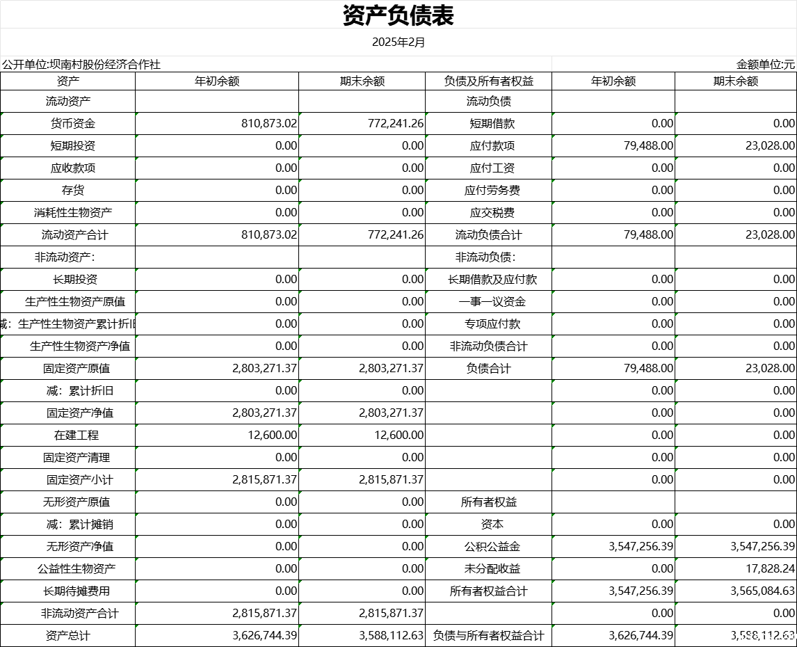 坝南村股份经济合作社2025年2月份资产负债表公示