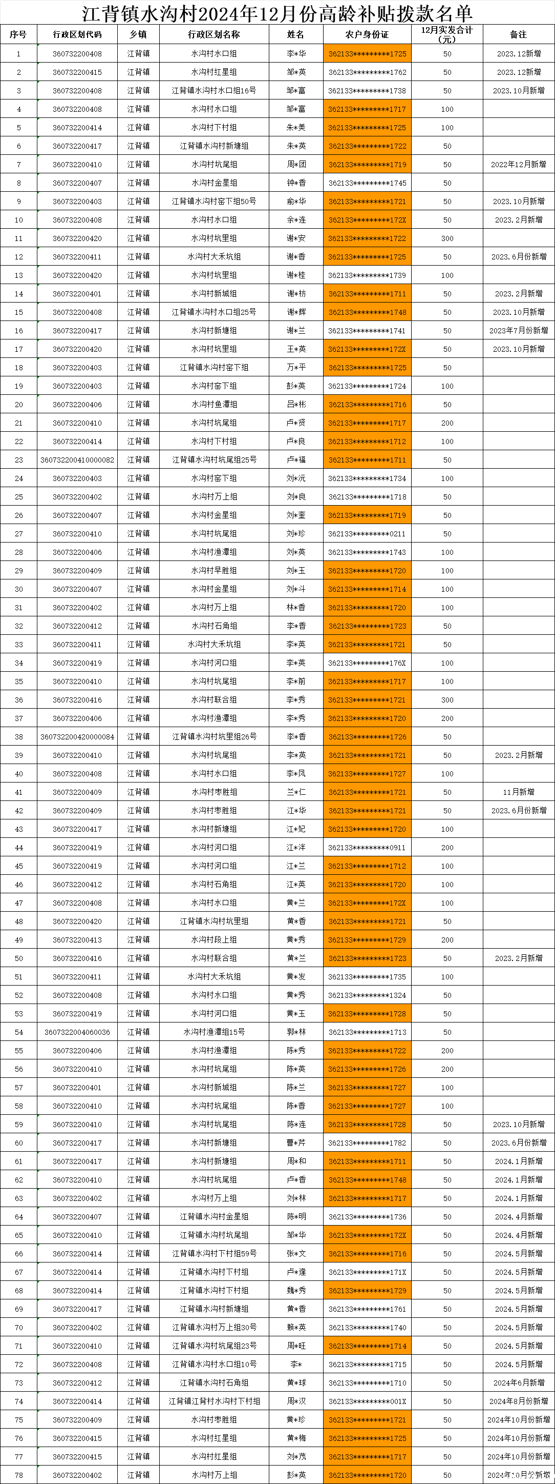 【养老服务】江背镇水沟村2024年12月份高龄补贴拨款名单