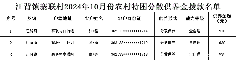【社会救助】江背镇寨联村2024年10月份农村特困分散供养金拨款名单
