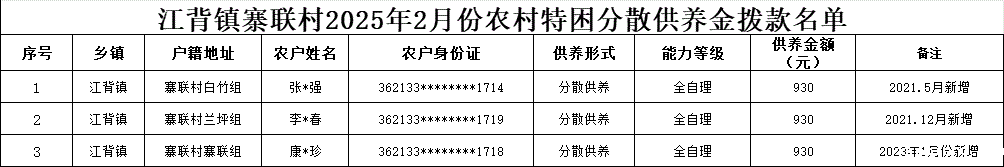 【社会救助】江背镇寨联村2025年2月份农村特困分散供养金拨款名单