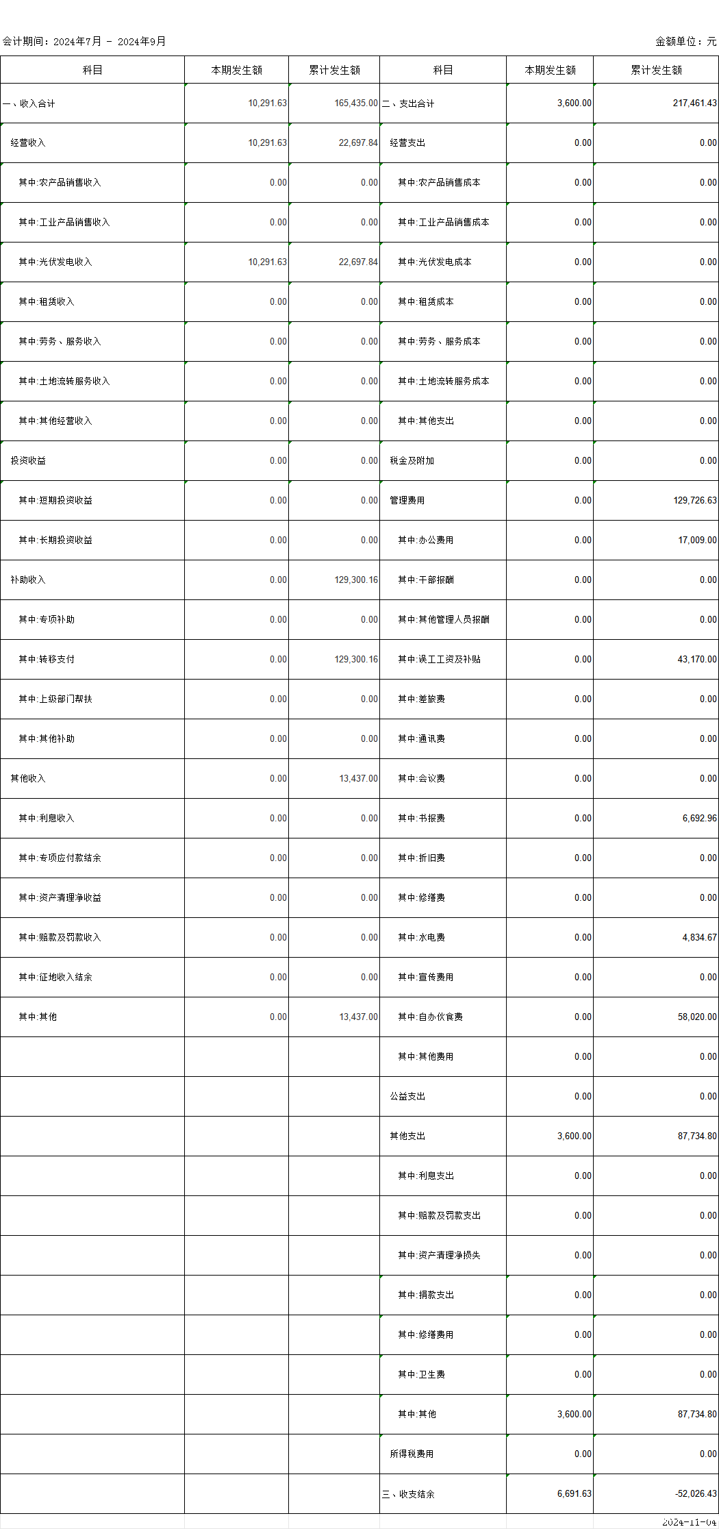 纸帮村2024年第三季度收入支出明细表