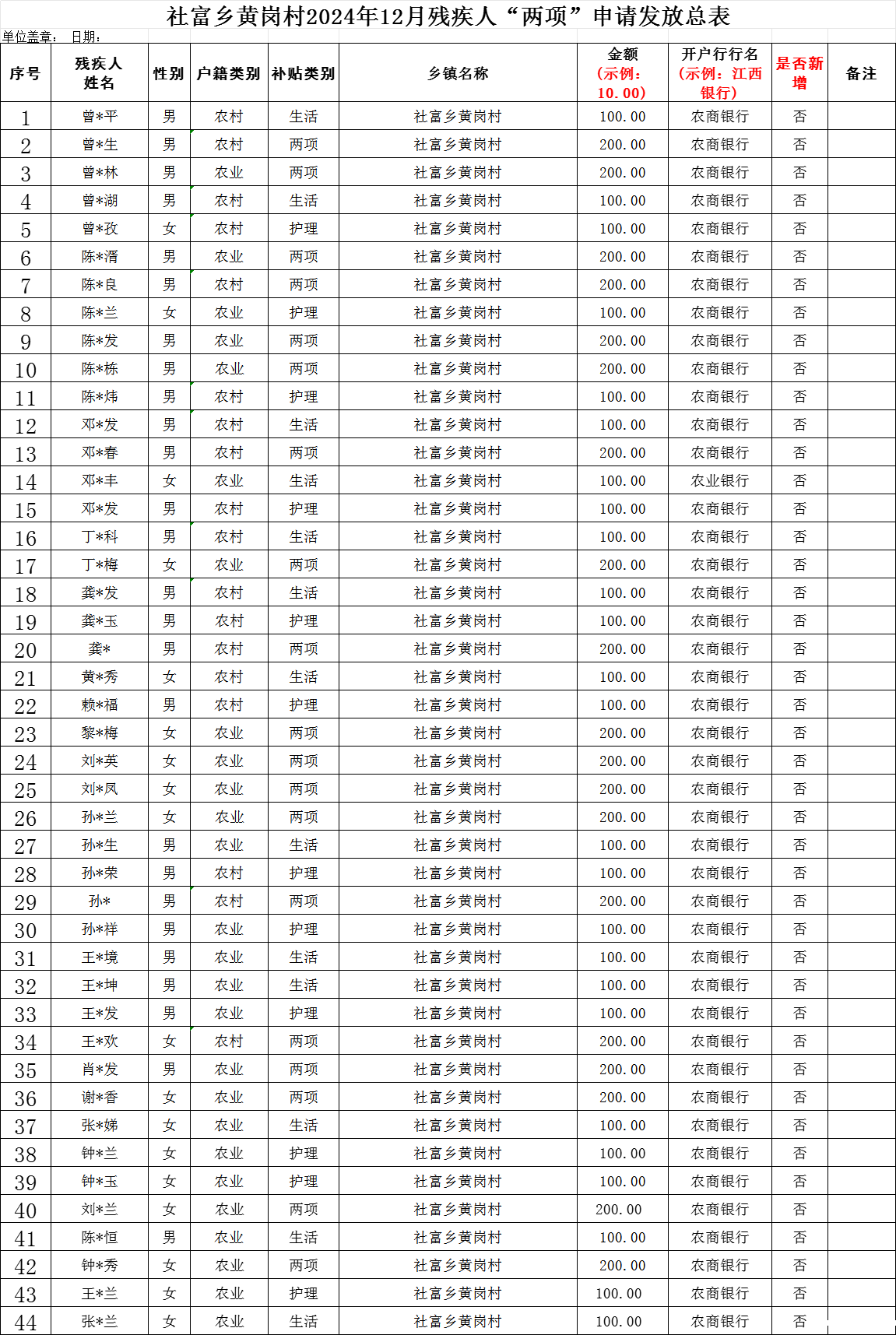 【社会救助】黄岗村2024年12月份残疾人两项补贴拨款名单