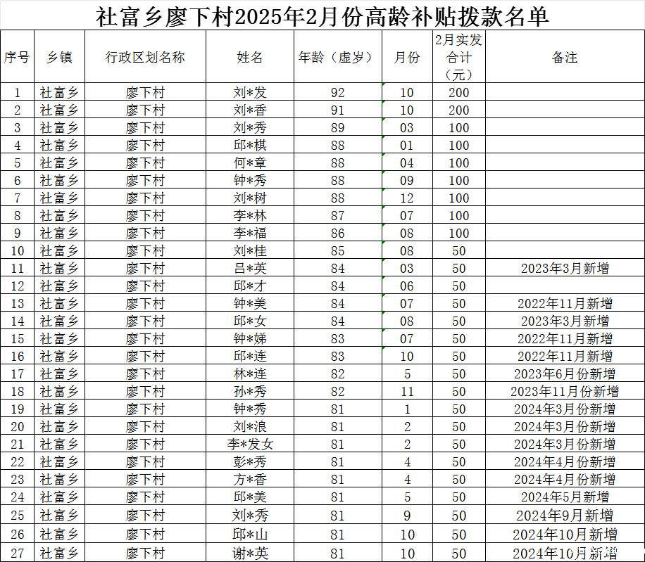 【养老服务】廖下村2025年2月高龄老人长寿名单