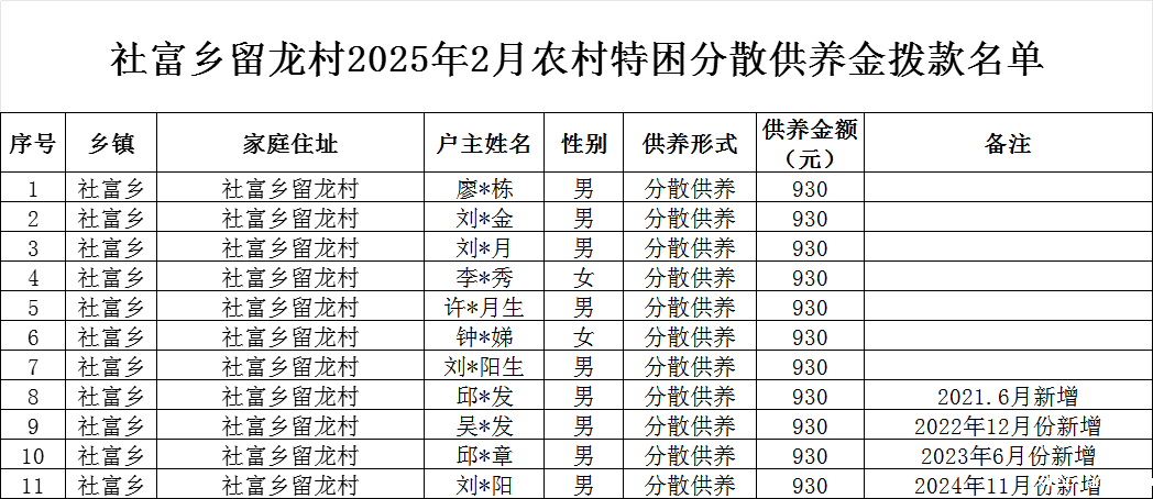 【社会救助】留龙村2025年2月特困确认样表