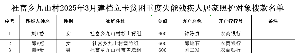 【社会救助】九山村2025年3月建档立卡贫困重度失能残疾人居家照护对象拨款名单