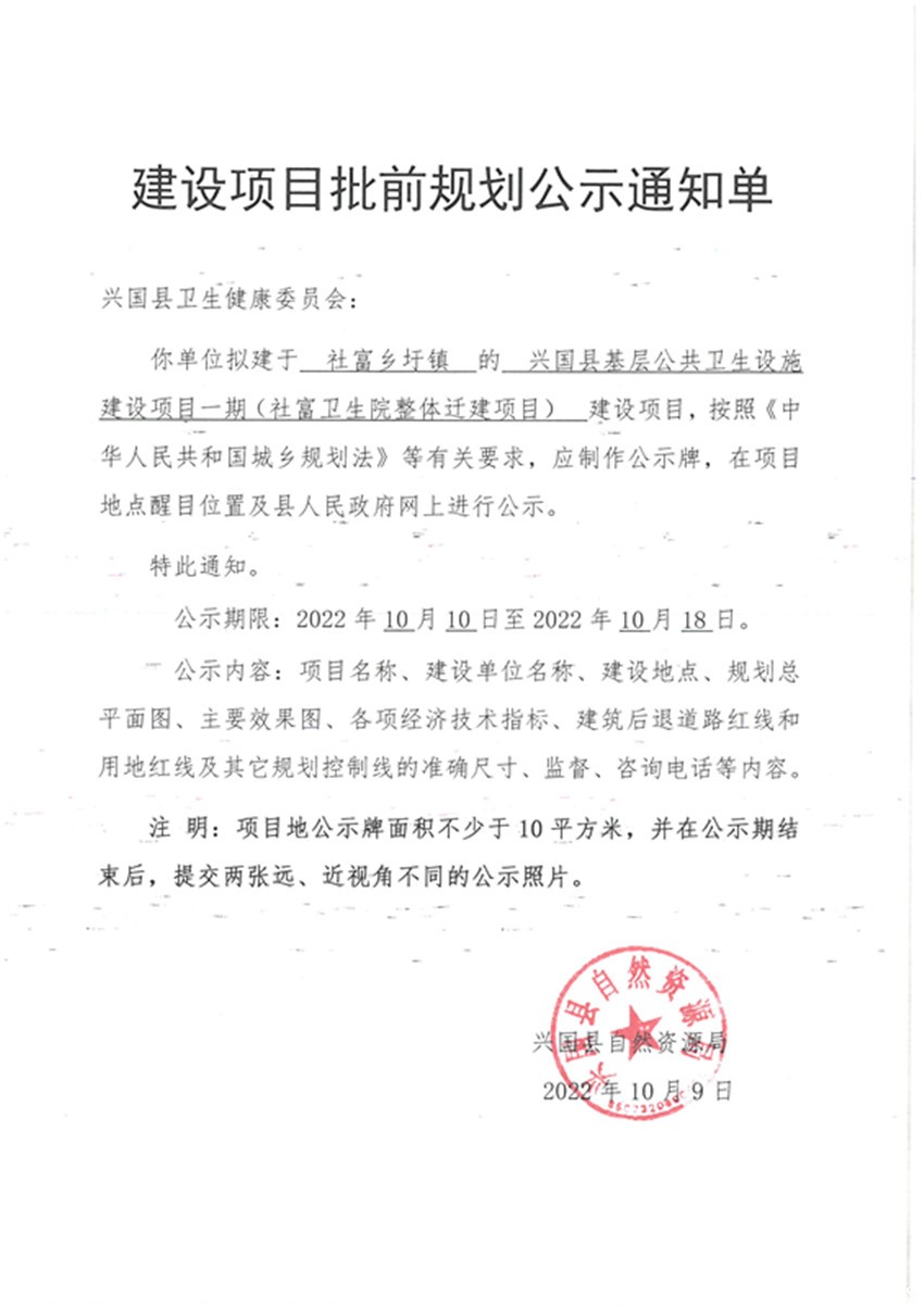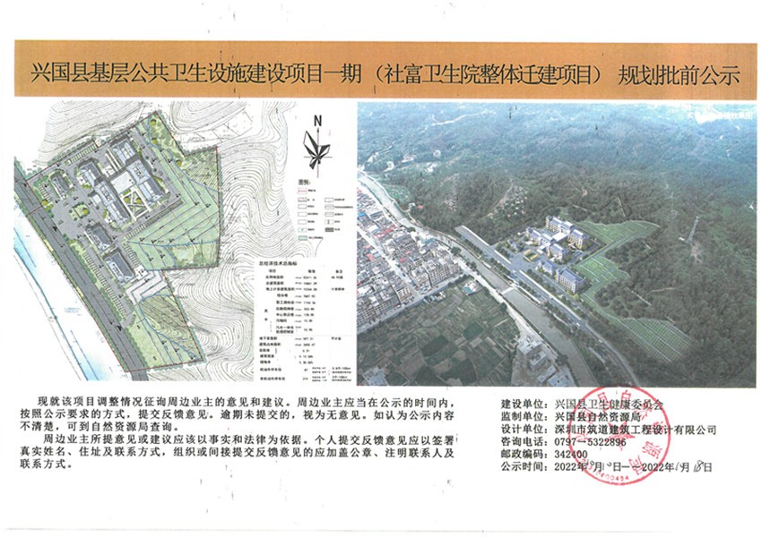 社富乡圩镇的兴国县基层公共卫生设施建设项目一期(社富卫生院整体迁建项目)建设项目批前规划公示
