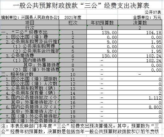 “三公”经费支出:指用一般公共预算财政拨款安排的因公出国(境)费、公务用车购置及运行维护费和公务接待费。其中,因公出国(境)费反映单位公务出国(境)的国际旅费、国外城市间交通费、住宿费、伙食费、培训费、公杂费等支出;公务用车购置及运行维护费反映单位公务用车车辆购置支出(含车辆购置税、牌照费),按规定保留的公务用车燃料费、维修费、过桥过路费、保险费、安全奖励费用等支出;公务接待费反映单位按规定开支的各类公务接待(含外宾接待)支出。
