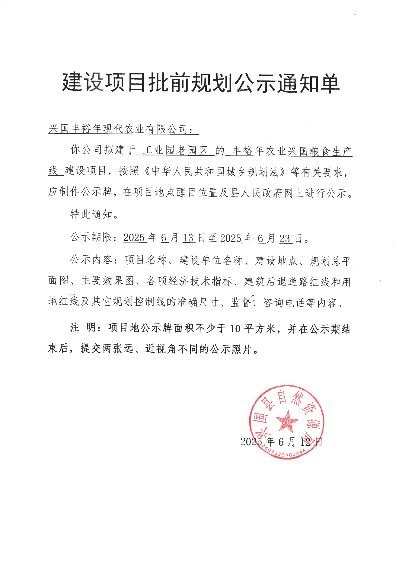 建设项目批前规划公示通知单
