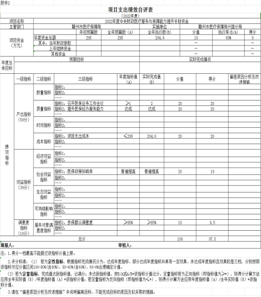 “2022年度中央财政医疗服务与保障能力提升补助资金”项目自评综述:根据年初设定的绩效目标,项目自评得分 97.5 分。项目全年预算数为 256 万元,执行数为204.6万元,完成预算的 69%。项目绩效目标完成情况:提升了医保信息化水平,加强网络、信息安全、基础设施等方面建设;加强了打击欺诈骗保工作力度,切实保障医保基金合理有效使用;有效提升了综合监管、经办服务、人才队伍建设等医疗保障服务能力。