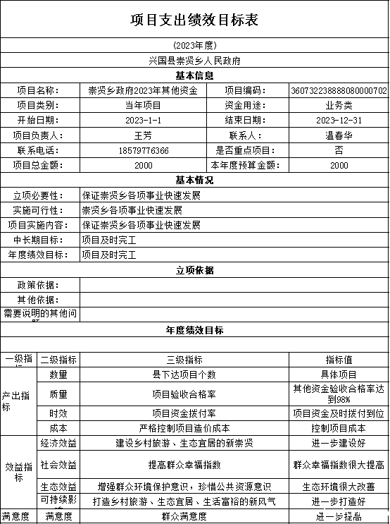 2023年实行绩效目标管理的项目1个,涉及资金2000.00万元。其中:项目名称:崇贤乡政府2023年其他资金