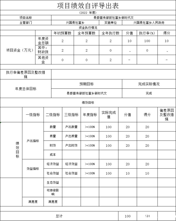 由于措施得当,管理有力,服务到位,基本达到预期目的。项目资金绩效评价得分 100分,等级为优。