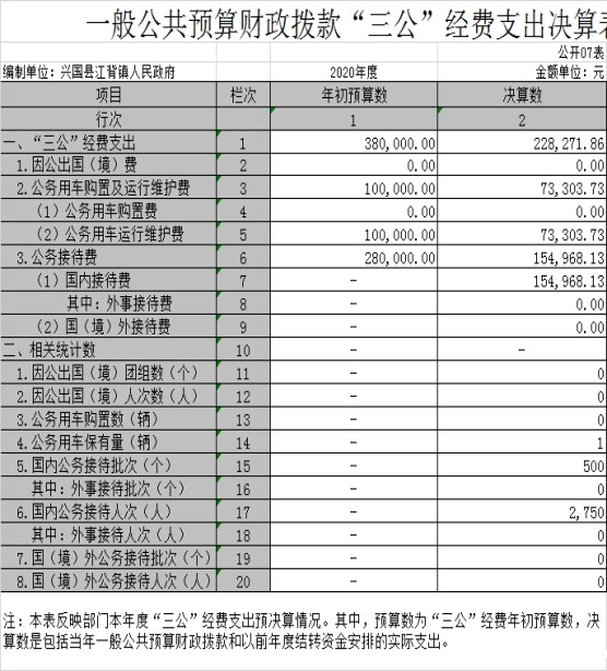 本部门2020年度一般公共预算财政拨款“三公”经费支出年初预算数为38万元,决算数为22.827186万元,完成预算的60.07%,较2019年下降了0.7万元,下降3%,其中: