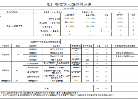根据年初设定的项目自评方案,此项目支出绩效设执行率 10 分。产出指标 38 分(分别为数量指标 10 分、质量指标 9 分、时效指标 9 分、成本指标 10 分)、效益指标40 分(社会效益指标 20分、可持续指标 20分)、满意度指标 10 分(服务对象满意度指标),合计 98分。