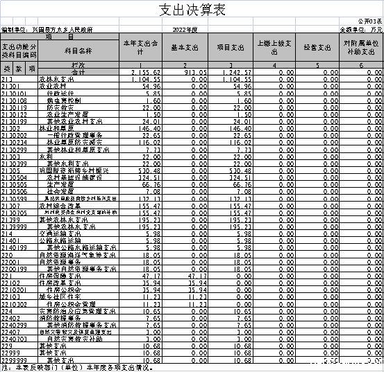 本单位2022年度支出总计2155.62万元,其中本年支出合计2155.62万元,较2021年增加189.25万元,增长9.6%,主要原因是:该年度乡村振兴项目资金的调整;年末结转和结余0.00万元,较2021年减少0.00万元,主要原因是:财政执行新政策,不再结转结余资金。