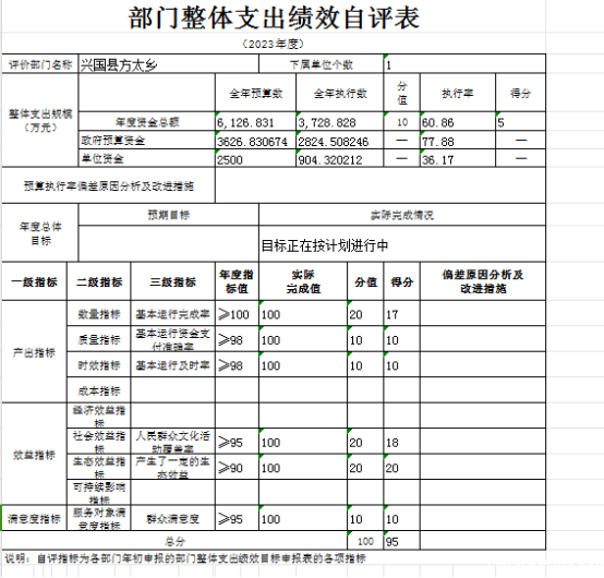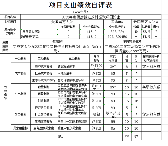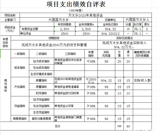 兴国县方太乡(本级)“方太乡政府2023年其他资金项目支出绩效自评表”如下: