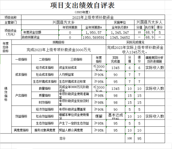 兴国县方太乡(本级)“2023年上级专项补助资金支出绩效自评表”如下: