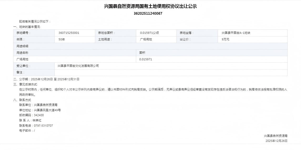 兴国县自然资源局国有土地使用权协议出让公示(宗地编号36202511240067)